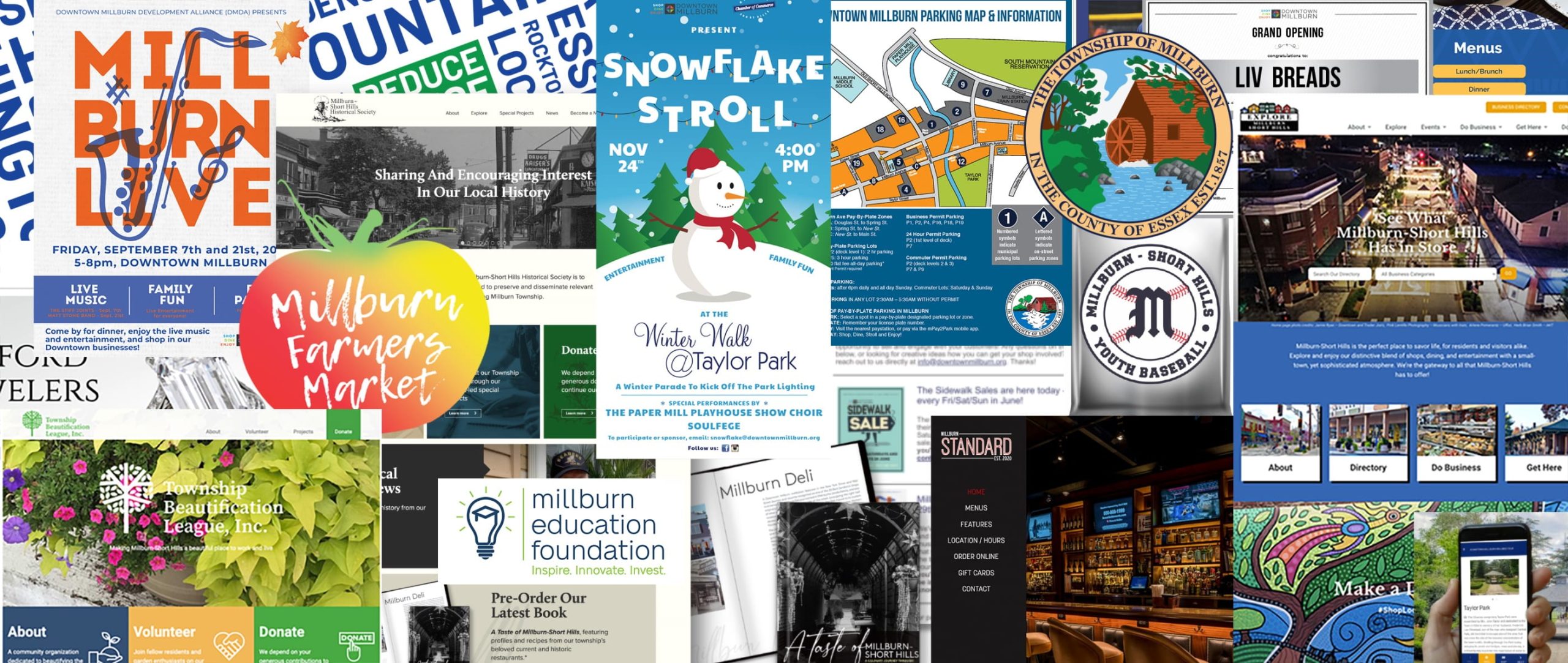 Our branding, design and development work extends from the local Farmer’s Market and the Millburn Education Foundation to the Township of Millburn and Town Hall itself. In addition, our website and digital work can be seen across such entities as the Millburn-Short Hills Historical Society, the Explore Millburn-Short Hills municipal site, and the Township Beautification League, as well as local recreation activities including Millburn-Short Hills Baseball and the Millburn Softball Club.